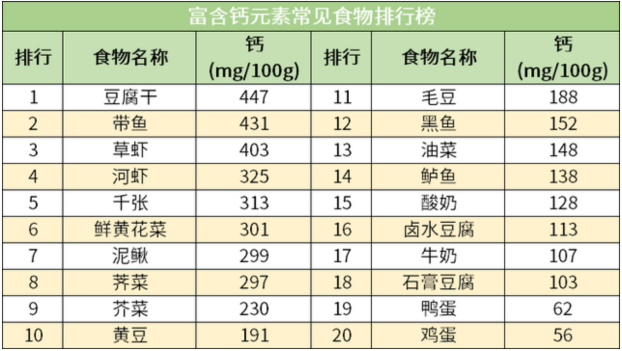 不少居民日常可能会额外增加摄入其他食物,比如牛奶、豆腐干等,因此并不是所有的居民都需要额外摄入钙剂。以下是富含钙元素常见食物排行榜,大家可自行计算每天钙元素摄入量,并合理安排钙剂补充。