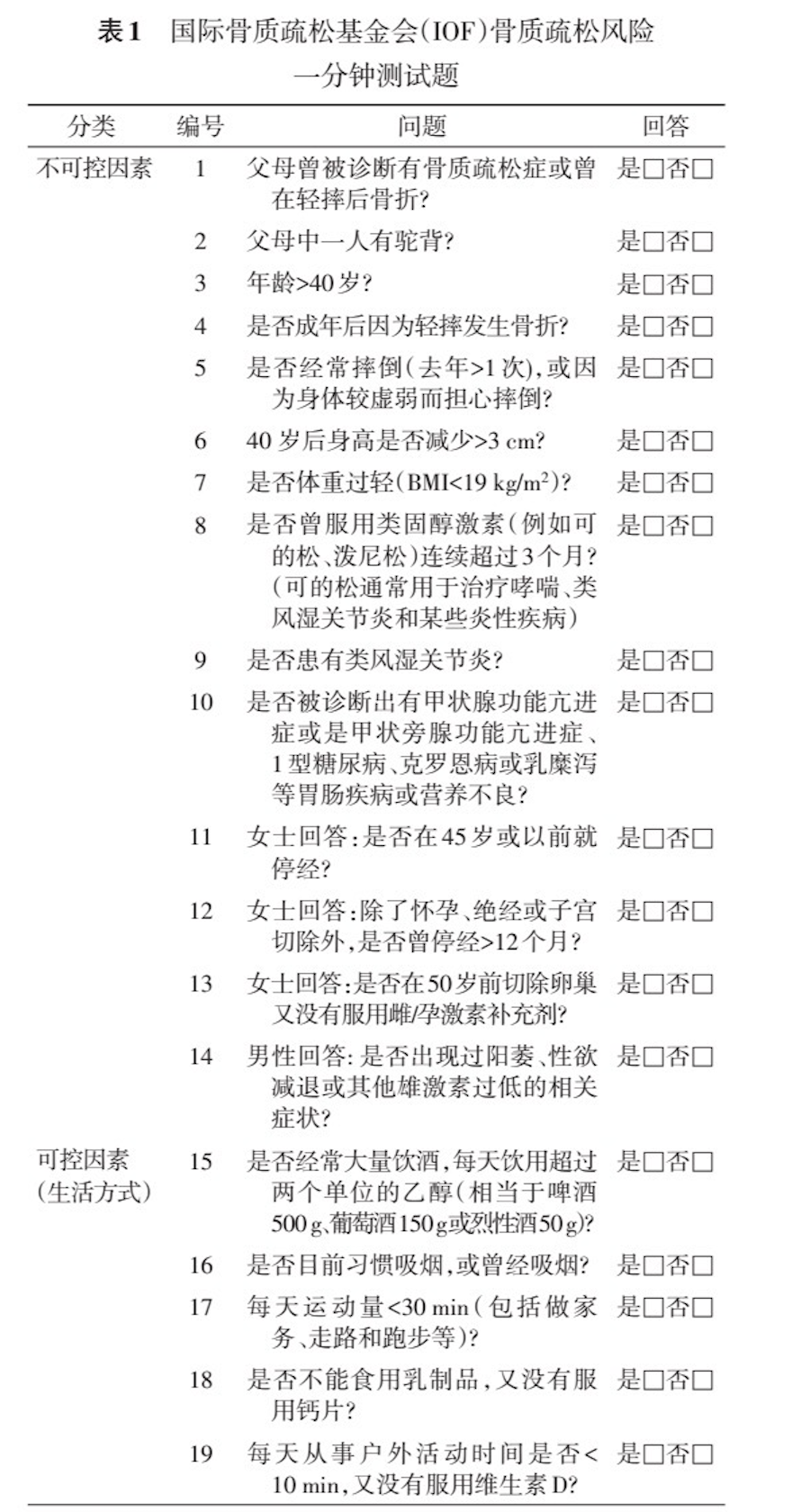 *导致OP的常见疾病:甲亢、糖尿病、库欣综合征、肿瘤、慢性肾功能衰竭等;导致OP的常见药物:糖皮质激素、抗惊厥药、甲氨蝶玲、环孢素、噻唑烷二酮类、质子泵抑制剂等。 导致骨质疏松症其实也有许多的不可控因素,比如性别、年龄、种族等。尽管不可控因素对发生OP有一定的负面影响,但疾病的进展是日积月累的,生活中许多不良的生活方式,对发展成OP起到促进的负面影响。日常生活中的长期久坐、活动过少、长期吸烟饮酒、日照减少、挑食造成营养不良等。这些不良生活习惯在日常生活中非常常见,且大家更多关心其带来的诸如肺部、心脏等器官损害,鲜少有人关心到骨骼的问题。这也直接导致大家对该疾病的忽略。后续发生的关节酸痛也易当成一般的关节炎对待,错过良好的治疗和预防时机。 因此提升老年群众对OP的认知,可以在一定程度上降低其发病率及致残率出现。 绝大部分OP患者无临床表现,因此对达到一定条件的患者,可以进行一次简单的一分钟问卷,来帮助群众了解自己的大致情况,以此来建议和提示患者,是否需要进行OP的基本筛查(截图源自文献):